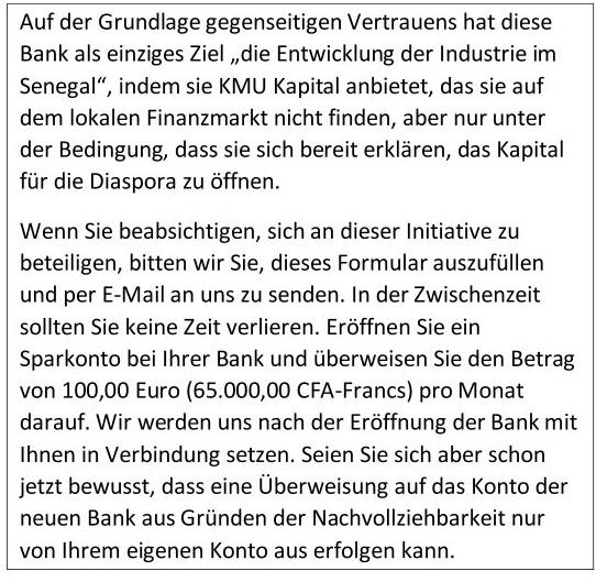 Diese Initiative richtet sich an die senegalesische Diaspora und ihre Familie, aber auch an die Diasporas aller afrikanischen Länder, die Mitglieder der OHADA-Organisation pour l’Harmonisation en Afrique du Droit des Affaires (Organisation zur Harmonisierung des Wirtschaftsrechts in Afrika)
